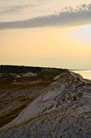Op het strand van de Baltische Zee, met duinen. Grote zandduinen die zich uitstrekken langs de kust. Zandstrand en zee. Landschapsopname bij de zee