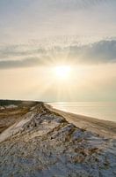 Op het strand van de Baltische Zee, met duinen. Grote zandduinen die zich uitstrekken langs de kust. Zandstrand en zee. Landschapsopname bij de zee