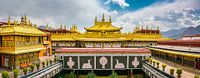 Op het dak van de Jokhang tempel in Lhasa, Tibet. Panoramafoto. De Jokhang tempel ligt in het oude centrum van Lhasa. De tempel heeft een enorme oppervlakte. Dagelijks lopen de Tibetanen om de tempel in processie, de gebedsmolens draaiend en mediterend.