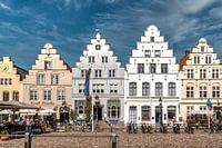 Markt in Friedrichstadt, Noord-Friesland, Sleeswijk-Holstein. De stad werd in de 16e eeuw gebouwd door Nederlandse Menonieten. Dat kun je zien aan de goed onderhouden en prachtig bewaard gebleven gevels. De stad wordt doorkruist door grachten, zoals het een Nederlandse stad betaamt.