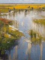 Een abstract Nederlands landschap met bossen en een meren. Als je je ogen samenknijpt kan je het zien. Dit is een serie van verschillende werken. Het is mooi om ze bijvoorbeeld naast elkaar te hangen. Zie mijn album genaamd: abstract voor meer werken.
