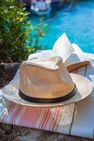 Zonnehoed met boek en handdoek op het strand