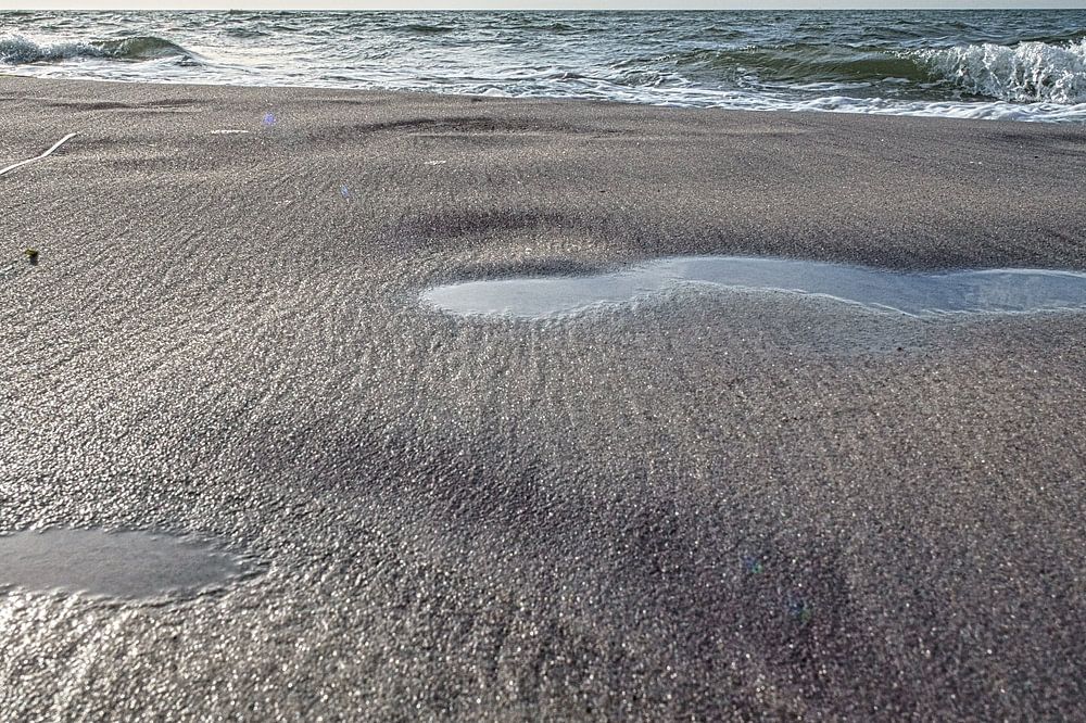 Op het zandstrand van de Baltische kust. Golven rollen van de zee op de kust. Zandstrand en wolken. Landschapsopname bij de zee