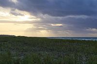 Op het zandstrand van de Baltische kust. Golven rollen van de zee op de kust. Zandstrand en wolken. Landschapsopname bij de zee