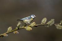Deze pimpelmees speurt de net uitgekomen bloesems af op zoek naar voedsel.