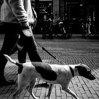 en zwart-witfoto die een alledaags maar tijdloos moment vastlegt: een wandelaar met een hond aan de lijn op de geplaveide straten van Groningen. De details van de texturen — van de jas en jeans van de wandelaar tot de vacht van de hond en de stenen ondergrond — versterken de eenvoud en schoonheid van het tafereel. Op de achtergrond…
