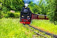 Een Harzer smalspoortrein op weg naar het Brockenplateau. Hier passeert hij het oude laadstation van Thumkuhlental. In meer dan vijftig minuten komt hij aan op het hoogste station dat adhesietreinen in Europa kunnen bereiken.