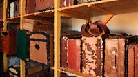 Een aantal reiskoffers en kisten dat staat te wachten op transport.