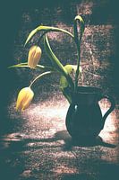 Tulpen in een vaas , bijna op het einde van hun korte leven als snijbloem . Eventjes brachten ze kleur in iemands leven , nu zijn ze op sterven na dood .