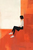 Een minimalistisch kunstwerk waarin een figuur in casual kleding contemplatief zit op een oranje achtergrond. De compositie straalt rust en eenvoud uit door het gebruik van warme oranje tinten tegen een lichte achtergrond, waarbij de zwart-witte kledingkeuze voor een sterk contrast zorgt. De illustratieve stijl is modern en sereen, met vloeiende lijnen en subtiele texturen.