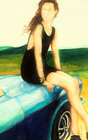 Aquarel van een jonge vrouw zittend op de motorkap van een blauwe Old Fashion sportwagen. Ik was geïnspireerd door een foto in een modeblad, deed me een beetje denken aan de schilder Jack Vettriano . Het enige wat me niet lukte met aquarel is om strakkere lijnen te maken, aquarelverf loopt doordat je water gebruikt altijd uit, dus…
