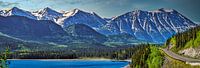 Rechts de weg langs het meer en in de achtergrond de besneeuwde bergen. Panoramafotografie. Prachtige natuur.