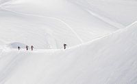 Vier mensen in de sneeuw op een die over een bergkam op we zijn naar de top van de berg