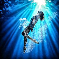De blauwe tinten domineren het doek en creëren een uitgestrekte, meeslepende onderwaterwereld. Het spel van licht en schaduw voegt diepte en drama toe, benadrukt het silhouet van de zwemmer en geeft de scène een dromerige sfeer. Dit contrast tussen licht en donker weerspiegelt de dualiteit van het leven - strijd en triomf, diepten en beklimmingen.
