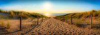 Na een tocht door de duinen en een klim naar boven, kom je uiteindelijk uit bij de de zee. Altijd een heerlijk gevoel om het weide uitzicht te zien bij een ondergaande zon. Aan de sporen te zien hebben vele badgasten vandaag al het traject gelopen. Nu aan het einde van het dag is het stil en rustig en is het genieten van de ondergaande zon.