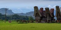 Een paar lagere school studenten op weg naar school. Ze lopen langs traditionele huizen (Tongkonan) en tussen de rijstvelden. Foto genomen in de buurt van Rantepao in het noordelijke gedeelte van het Toraja gebergte in Zuid Sulawesi, Indonesie.