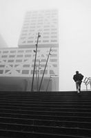 Man beklimt de trap naar zijn werkzaamheden in het stadskantoor van Utrecht. Buitenopname in de mist in zwart wit met laag perspectief