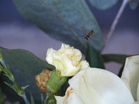 Een bij zweefde langzaam en bijna sierlijk door de lucht, precies op weg naar een van de pas geplante bloemen.