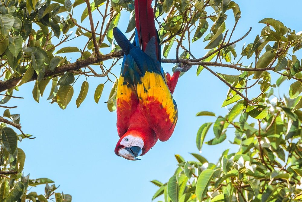 Deze betoverende foto vangt de majestueuze ara's in Costa Rica, gehuld in een opvallende combinatie van rood en blauw. Hun verenpracht straalt een vurige pracht uit, en de dynamiek tussen de kleuren brengt de weelderige natuur van Costa Rica tot leven.