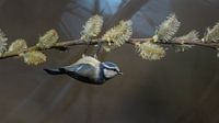 Deze pimpelmees zoekt tussen de opkomende bloemen naar voedsel.