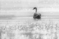 Een zwart-wit foto van een zwemmende knobbelzwaan. Hij schijnt op zoek te zijn naar zijn partner. Op de voorgrond glinstert de ochtenddauw in het gras.