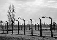 Het karakteristieke hek en lampen van Auschwitz Birkenau.