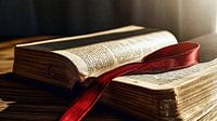 Een open Heilige Bijbel met een rood lint ligt op een rustieke houten tafel. Het warme zonlicht verlicht het tafereel en creëert een vredige sfeer die geloof en toewijding weerspiegelt.