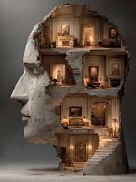 Een surrealistisch kunstwerk van een menselijk gezicht, onthult een interieur dat doet denken aan een knus huis. Het hoofd bestaat uit meerdere verdiepingen vol warm verlichte kamers, versierd met klassieke meubels en schilderijen. Trappen verbinden de verschillende ruimtes en vermengen de concepten van geest en architectuur in een fantasierijke weergave.