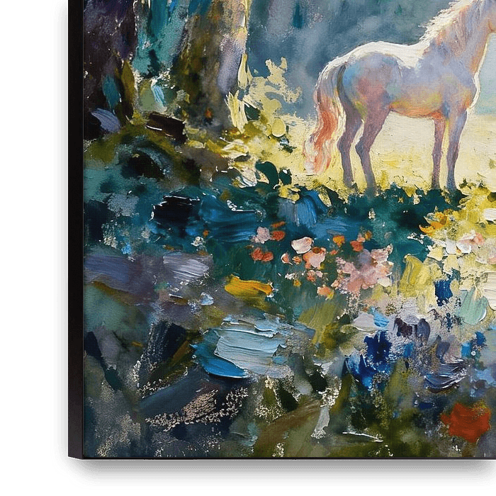 Een delicate eenhoorn staat rustig in een zonovergoten bosopen plek, omringd door impressionistisch geschilderde bomen en kleurrijke bloemen. De pastelkleurige groene, blauwe en roze tinten versmelten in een levendige, gestructureerde schilderstijl die doet denken aan olieverfschilderijen. Het zachte licht op de achtergrond creëert een…