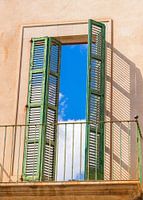 Open rustieke oude vensterluik en balkon met uitzicht op de hemel
