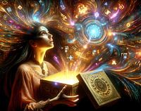 Openen van Pandora's box. Een mooie vrouw opent een doos vol ideeen, emoties en concepten.