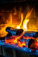 Een warm lichtspel danst levendig tussen knisperende houtblokken, terwijl de sintels zacht gloeien in rood-oranje tinten. De verleidelijke geur van brandend hout vult de lucht en een gevoel van gezelligheid verspreidt zich. De vlammen likken speels aan de randen van de houtblokken en creëren een sfeer vol gezelligheid en warmte.