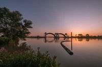 Op een zomerse avond in 2021 ontvouwde zich een sprookjesachtige zonsondergang bij het stuw- en sluizencomplex Amerongen, aan de oever van Maurik. De lucht baadde in een gouden paarsblauwe gloed, terwijl de zon langzaam onder de horizon zakte, haar laatste stralen werpend op het water.