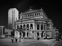 Foto van het centrum van Frankfurt am Main die met behulp van digitale bewerking omgezet is naar Zwart-Wit en Nacht fotografie. Het gericht aanbrengen van lichtpunten helpt om de aandacht van de kijker te sturen.