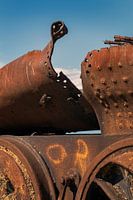 Opgeblazen stoomketel van een locomotief. Roestend staal op een sloperij. Nieuw Zeeland. Oamaru.