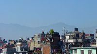 Kathmandu, Nepal in de middag met veel zon. Blauwe lucht, gekleurde huizen en het himalaya gebergte op de achtergrond.