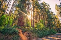 Zonnestralen tussen sequoia's vanaf de Generals Highway. Gefotografeerd in Sequoia National Park. Provincie Tulare, Californië, Verenigde Staten.