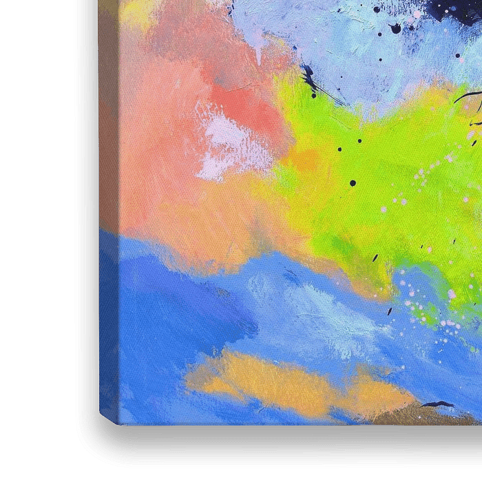Levendig blauw, geel en groene vlekken versmelten met zwarte spetters om een dynamisch en abstract beeld te creëren. Kleurspatten en energieke streken roepen een gevoel van beweging en emotie op bij de toeschouwer.