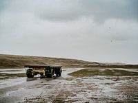 Lege oplegger op een verregende en verlaten parkeerplaats op Texel