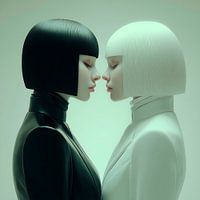 Een kunstwerk van twee vrouwen met een identieke, minimalistische kapsels die hun gezichten omlijsten. De vrouwen hebben een bijna surrealistische uitstraling, met kalme en serene uitdrukkingen. De compositie roept een gevoel van dualiteit en harmonie op.