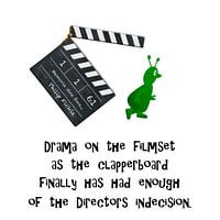 Cartoon animation. Clapperboard filled in with a very high number of takes. Drama as the clapperboard finally has enough of the directors indecision.