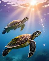 Een close-up van een zeeschildpad in kristalhelder, blauw water vangt een rustig maar indrukwekkend moment: het volwassen dier glijdt rustig omhoog in een hoek, zijn schild toont duidelijke vlekken van algen en ruwe korststructuren die leven en geschiedenis geven aan elke lijn. Zonsonderganglicht breekt door het wateroppervlak in warme…