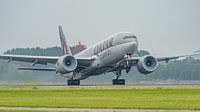 Een Boeing 777 vrachtvliegtuig van Qatar Cargo stijgt op van de Aalsmeerbaan van luchthaven Schiphol.