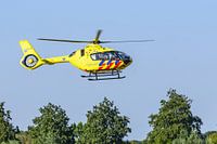 Trauma helikopter stijgt op boven de bomen. De ANWB Medische Luchtverkeersleiding vervoert medisch personeel voor assistentie op de plaats van het ongeval. De helikopter is een Airbus Helikopter H135 met registratie PH-DOC.