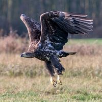 De jonge zeearend is met een paar imposante slagen van zijn enorme vleugels snel in de lucht. De imposante klauwen zijn goed te zien.