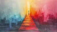 Dit surrealistische schilderij toont een persoon die een lange trap oploopt naar een stralend licht. Het tafereel is doordrongen van een mystieke sfeer en symboliseert hoop, geloof en de overgang naar het hiernamaals. De trap, die zich eindeloos lijkt uit te strekken, symboliseert de reis van het leven en de uitdagingen die men moet…
