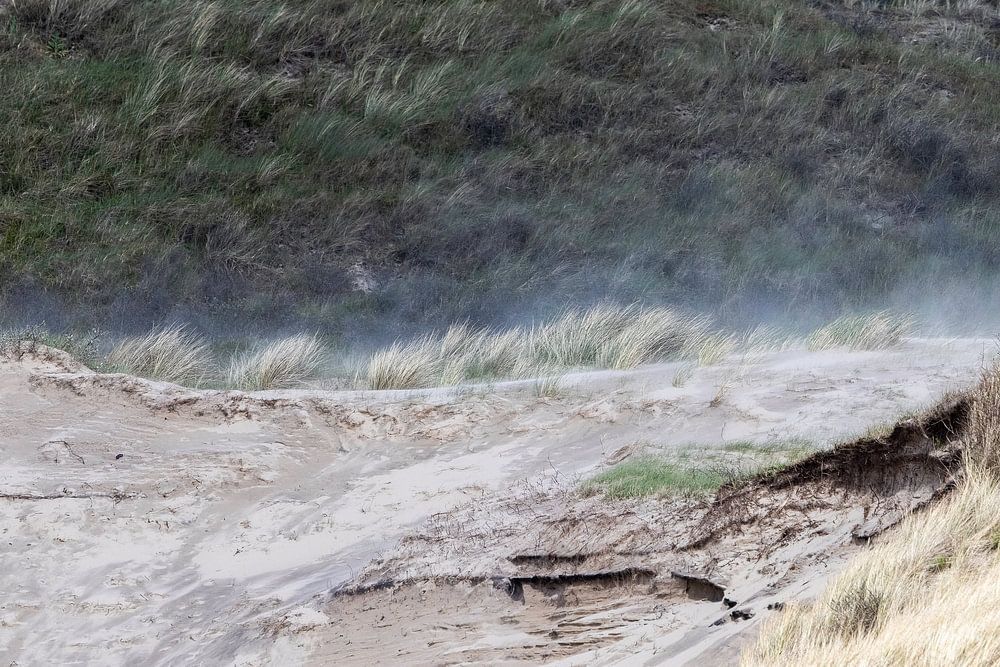 Ondanks een stormwaarschuwing van het KNMI ben ik de duinen ingegaan om te fotograferen. Ik was eigenlijk op zoek naar vossen of herten, maar de dreigende lucht in combinatie met de harde wind zorgde voor bijzondere taferelen. De windvlagen werden zo hard dat ik moeite had met het stilhouden van de camera.