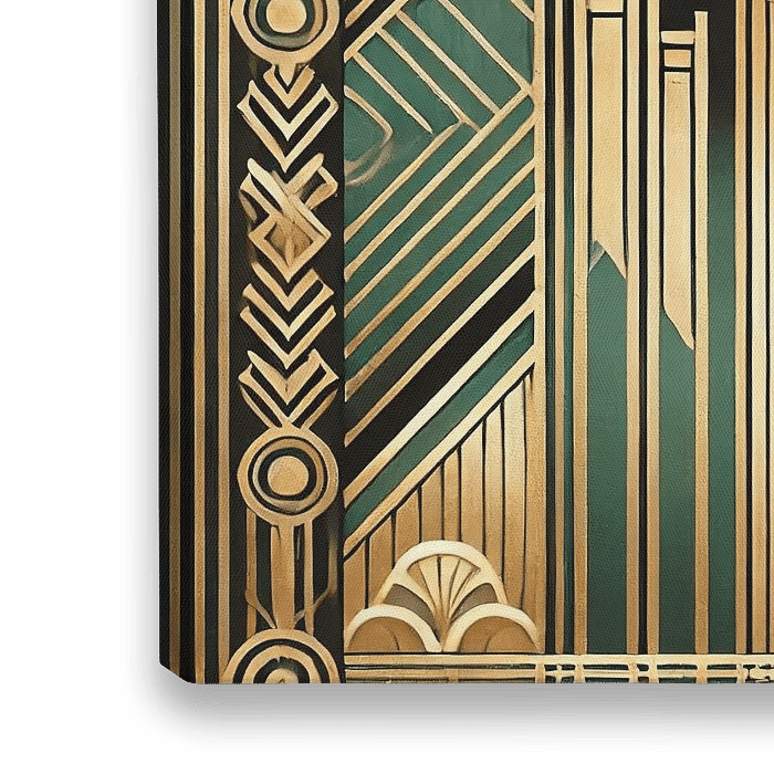 Goud, ivoor en diepgroen vormen samen een compositie van deco-weelde. Trapsgewijze stralen komen uit een centrale as en ontmoeten scherpe randen, terwijl kleine waaieremblemen en afgemeten lijnen ritme toevoegen zonder het oog op te sluiten. Het licht voelt beheerst en architectonisch, meer email en messing dan glitter, met subtiele tonale verschuivingen die het oppervlak levendig maar ingetogen houden.