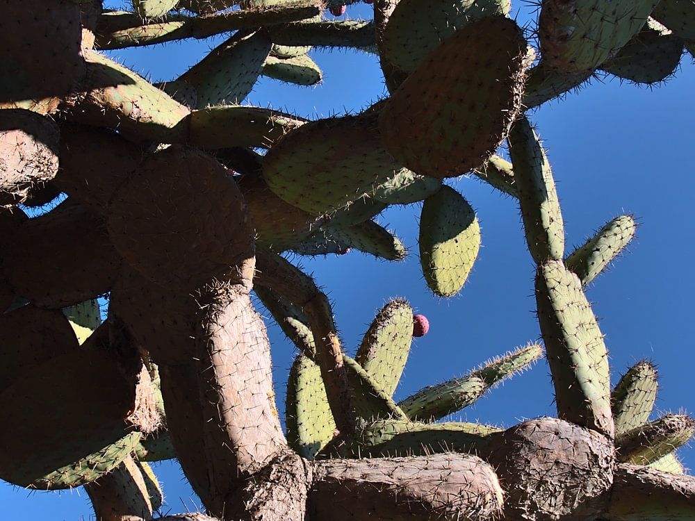 Close-up van een cactus van het geslacht Opuntia van onderen met stekelscheuten op een zonnige dag met blauwe lucht.