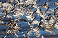 Opvliegende groep meeuwen aan de Nederlandse kust